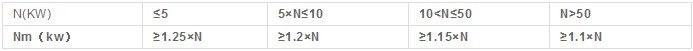 泵的選型確定后,根據樣本數據可查到三螺桿泵的軸功率 N ,該軸功率再加上一定的功率儲備后,作為選配電機的依據,一般電機功率 Nm 應不小于泵軸功率 N 乘以功率儲備系數 K 后所得值,K 值可參照下表取值: