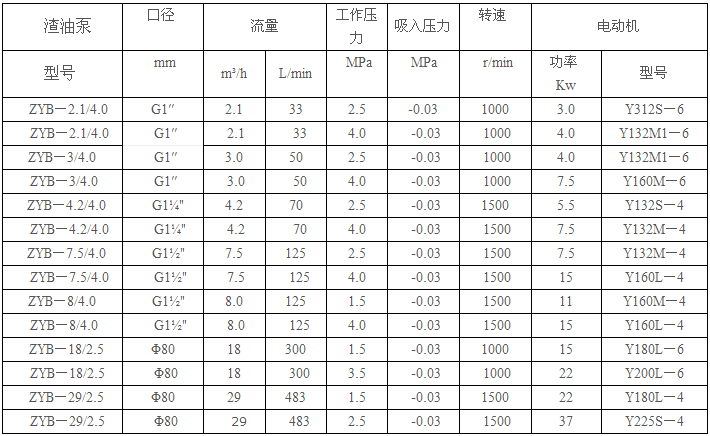 高壓渣油泵采用 創的液力平衡技術,使泵在高溫高壓工作時,效率高、噪音低、壓力穩定、保壓時間長等 性能。由于高溫渣油泵采用整體碳鋼材質,泵工作溫度可達300℃,工作壓力可達4.0MPa以上,運行 ,主要用于高溫、高壓,對環境、工作場地有要求的重要場合。它對各種低檔劣質燃燒油的高溫高壓輸送和噴射有較好的適應性。泵的性能和參數見下圖表。